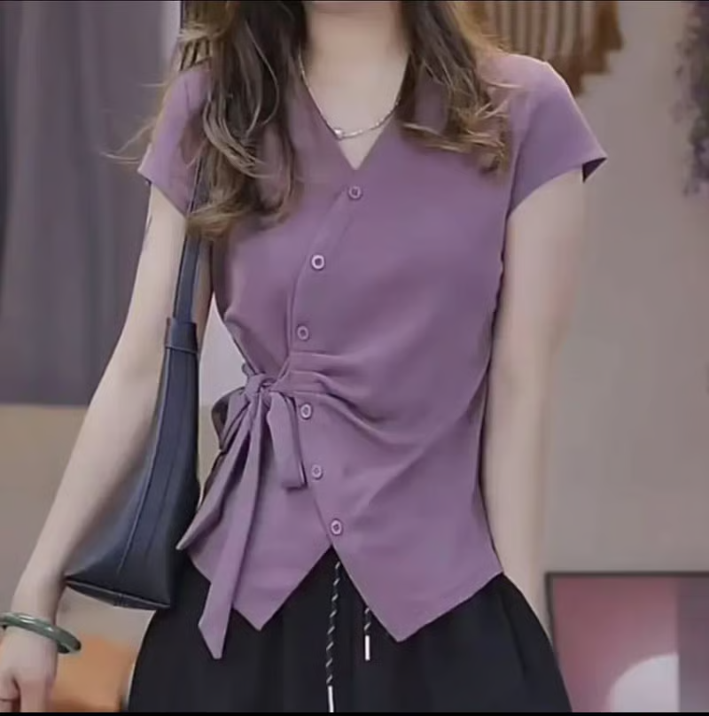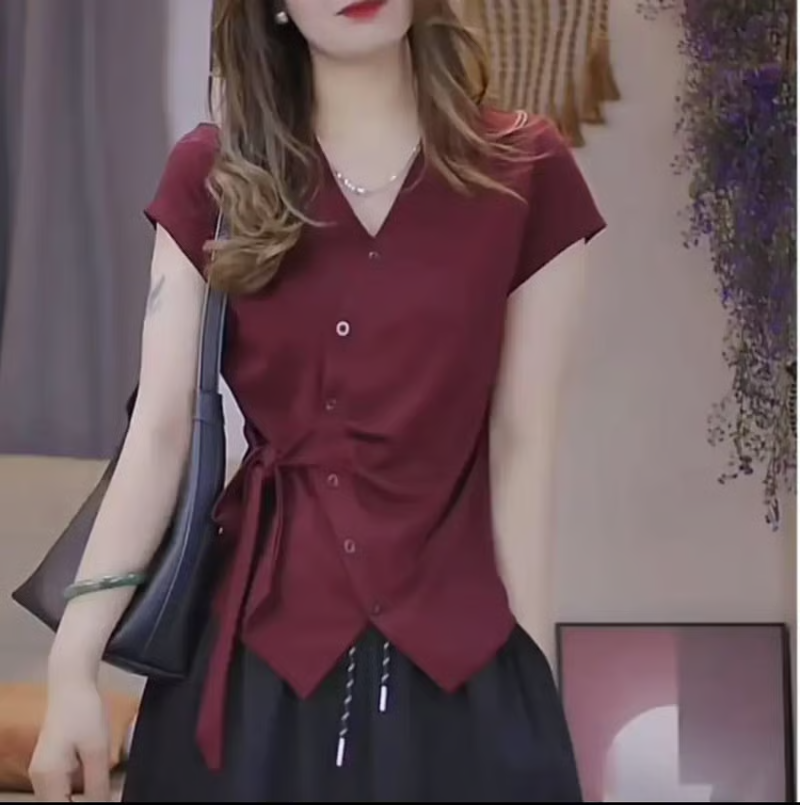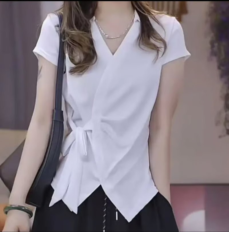 12分鐘前夏季新款重工不規則設計短袖時尚綁帶V領T恤女修身顯瘦上衣女 - 【超值團購】到手3件-NT$1699